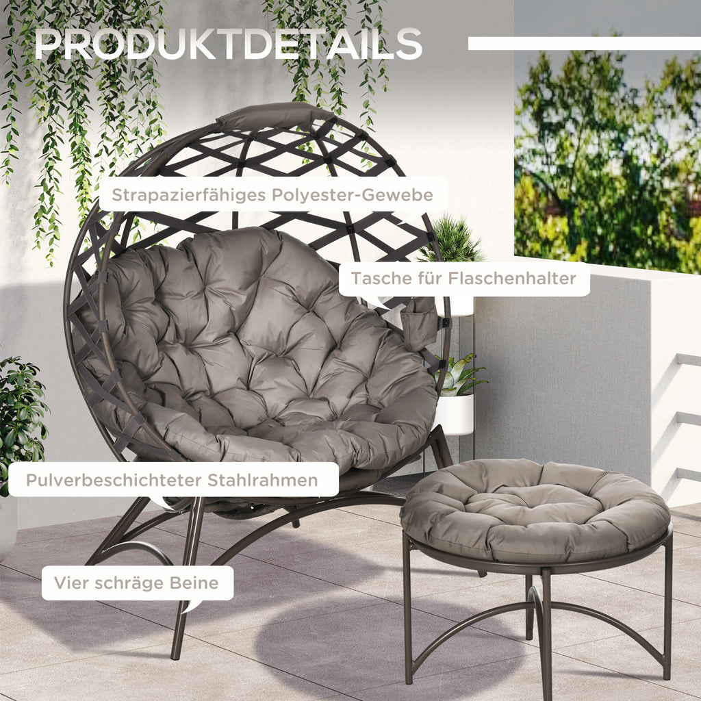 Genießen Sie zu zweit die frische Gartenluft auf diesem gemütlichen Gartenstuhl von Outsunny. Die Sitzschale lässt Sie bequem einsinken, während der Hocker im Handumdrehen in einen Beistelltisch verwandelt werden kann. Unglaublichen Komfort bietet das große, weiche Sitzkissen, das den gesamten Sitzkorb ausfüllt. Dank des praktischen Klappdesigns lässt sich der Stuhl bei Bedarf zusammenklappen und verstauen. Zudem bietet der starke Stahlrahmen eine kompromisslose Stabilität und sichere Balance.