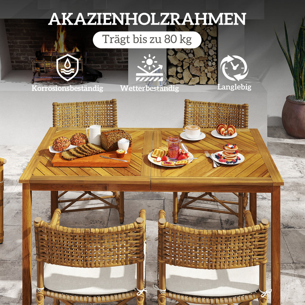 Treffen Sie sich an unserem Outsunny Gartentisch mit Schirmloch, dem perfekten Mittelpunkt für Ihr nächstes Gartenfest oder ein gemütliches Beisammensein. Mit einer Größe von 150 x 85 cm bietet der Gartentisch Platz für sechs Personen und hat ein Schlitzdesign, das Wasseransammlungen vermeidet. Ein praktisches Schirmloch des Gartentisches ist ideal für sonnige Tage. Aus natürlichem Akazienholz gefertigt, hält er allen Jahreszeiten stand!