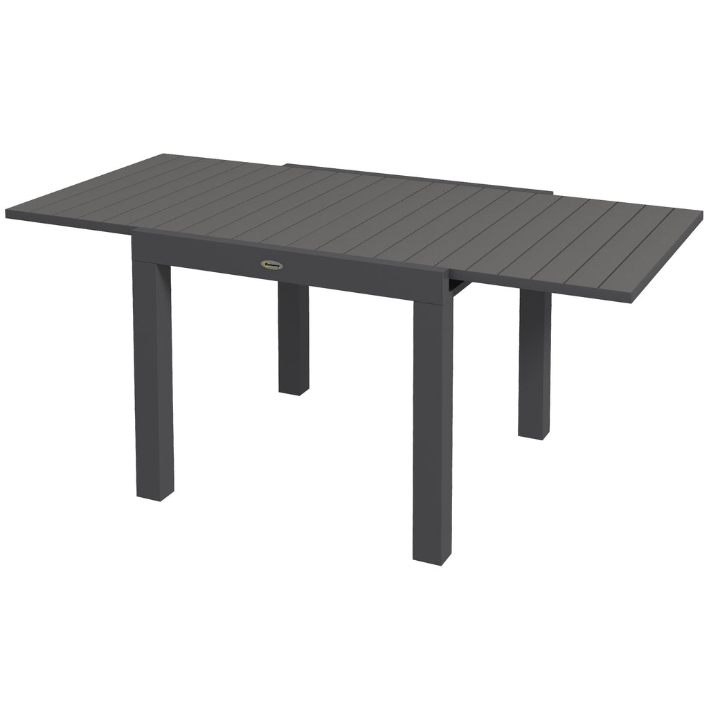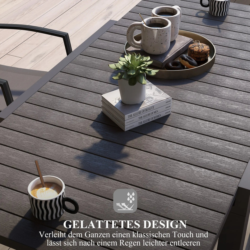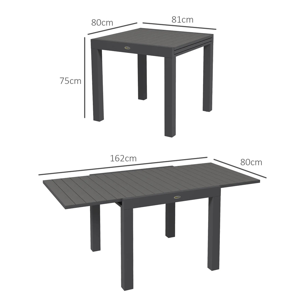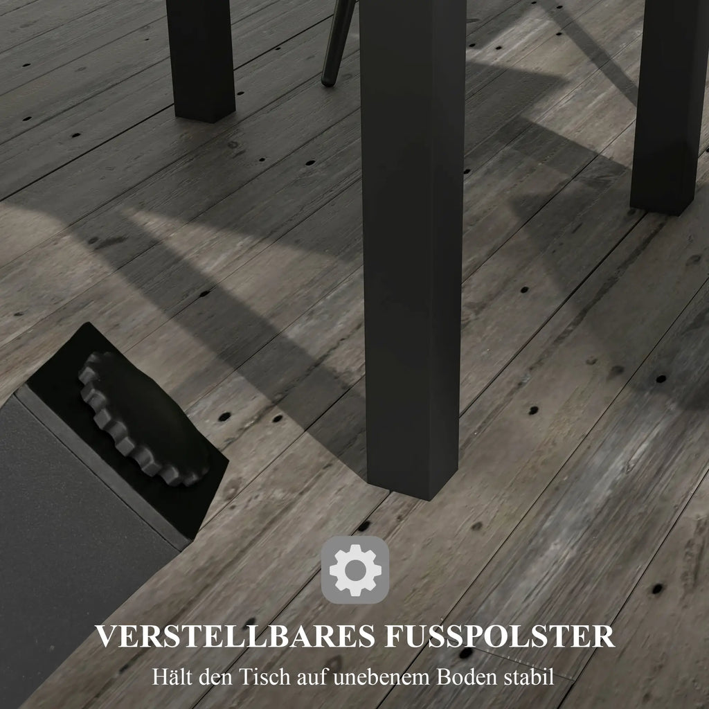 Der ausziehbare Terrassentisch Outsunny ist ein vielseitiger Tisch, der sich Ihren Bedürfnissen anpasst. Er bietet Platz für vier Personen und lässt sich leicht auf sechs erweitern, wenn Gäste kommen. Er besteht aus pulverbeschichtetem Aluminium. Er ist wasserdicht, leicht und einfach zu bedienen. Regen kann dank des klassischen Lattenrostdesigns einfach abfließen. Die Fußstützen des Balkontisches sind verstellbar. Sie passen sich jedem Bodenbelag an.