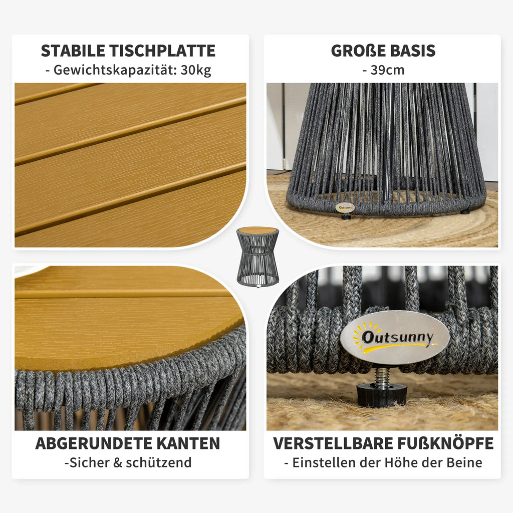 Kleine Gartentische sind nicht unbedeutend, sie sind wichtige Einrichtungsgegenstände für einen gemütlichen Gartenbereich. Dieser Tisch von Outsunny verleiht ihrem Außenbereich einen modernen Boho-Stil. Der Rattan-Gartentisch kann leicht von einem Ort zum anderen bewegt werden. Er eignet sich als Beistelltisch für die Terrasse, den Garten oder die Veranda. Egal ob als Pflanzenhocker, Couchtisch oder als Ablage - dieser Gartentisch wertet jeden Außenbereich auf.