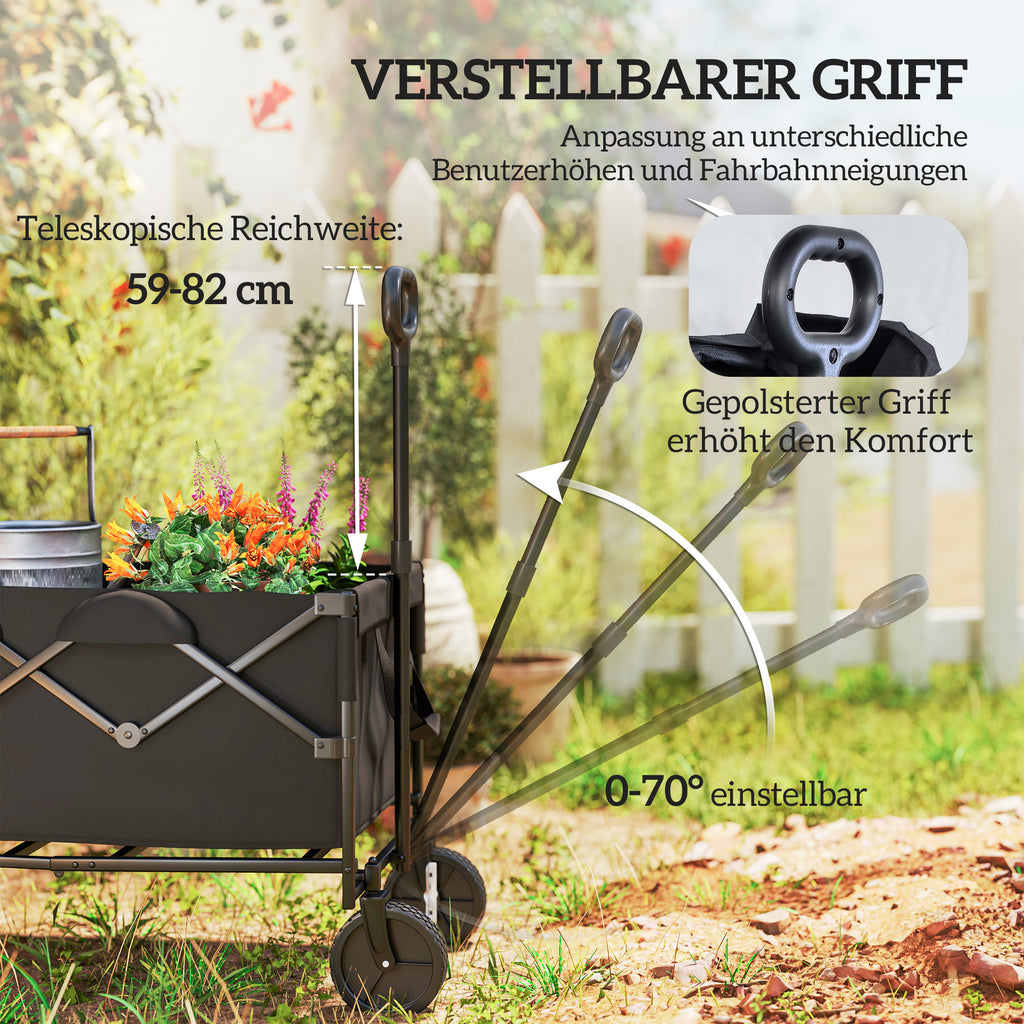 Erleben Sie die Natur mühelos! Unser faltbare Bollerwagen mit einem Fassungsvermögen von 160 L und einem innovativen Heckklappen-Design erweitert den Stauraum für umfangreiche Ausrüstung. Ausgestattet mit einem robusten, pulverbeschichteten Stahlgestell und spritzwassergeschütztem Oxford-Stoff, ist der klappbare Bollerwagen jeder Herausforderung gewachsen. Das klappbare Design und die 360° schwenkbaren Räder des Klappbollerwagens garantieren leichte Manövrierbarkeit auf allen Untergründen.