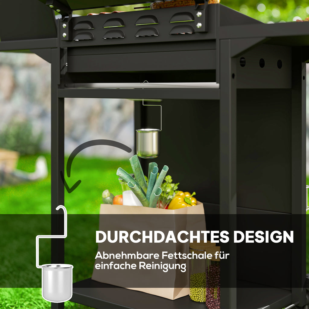 Zünden Sie Ihren Garten BBQ mit dem Outsunny Gasgrill an! Der Gasgriller bietet eine Grillfläche von 2320 cm² und einen Warmhalterost, ideal für große Festmahle. Der Seitenbrenner des Gasgrillers hält Saucen und Beilagen warm, während das Hauptgericht auf perfekte Weise gart. Individuell zündbare Brenner und ein integriertes Doppelthermometer erleichtern das Erreichen der idealen Grilltemperatur.