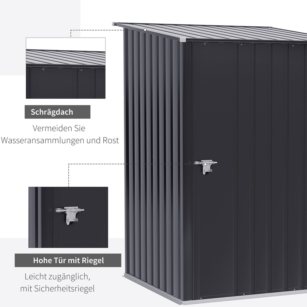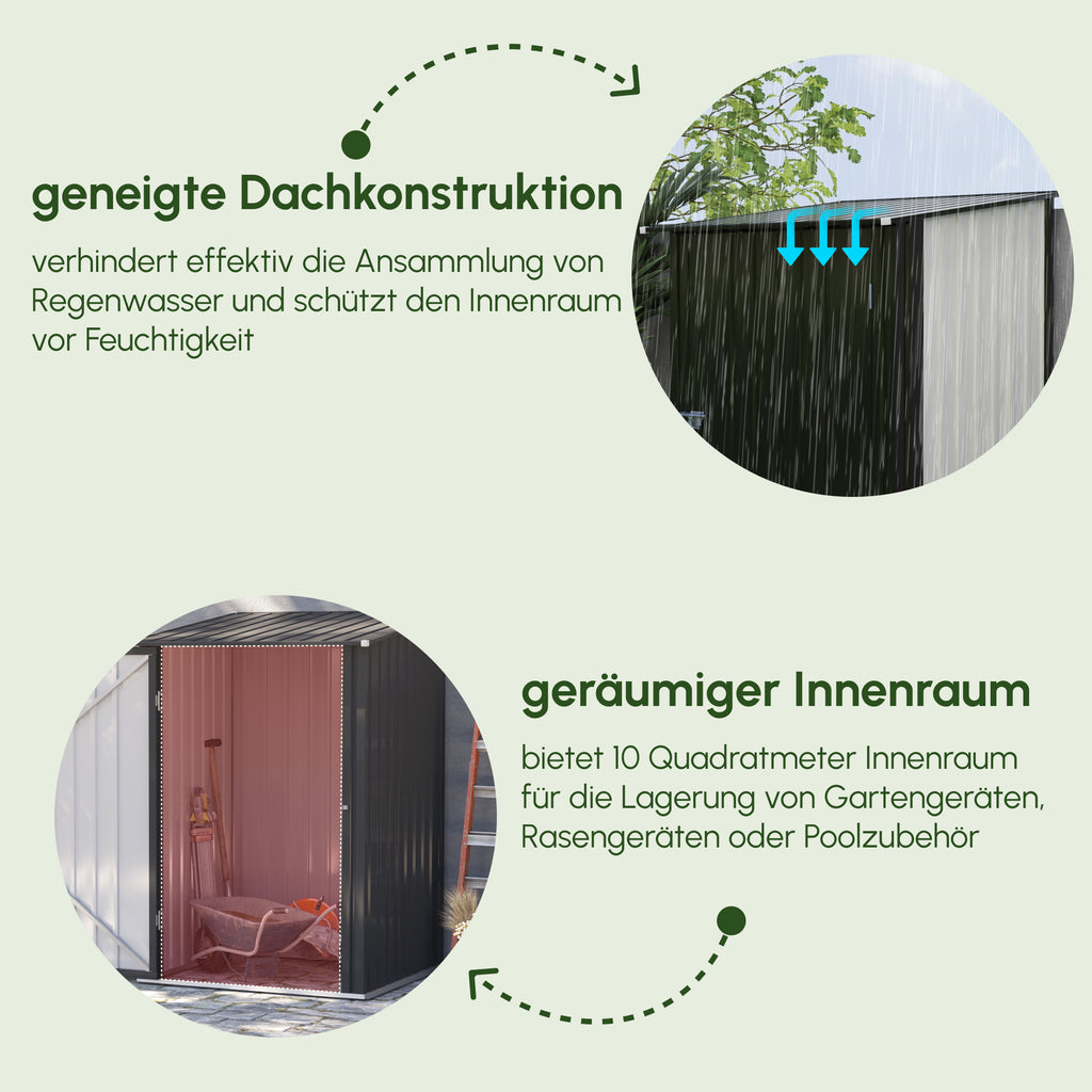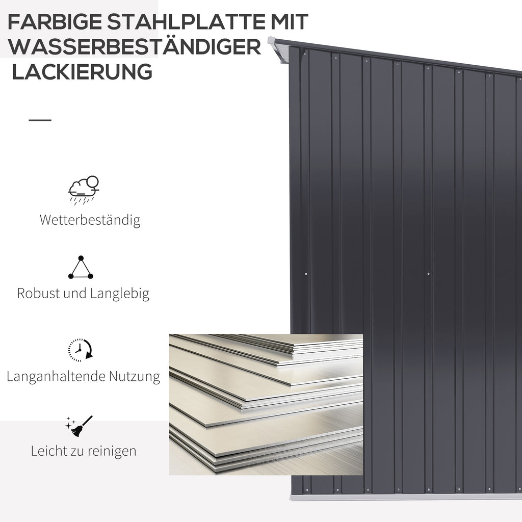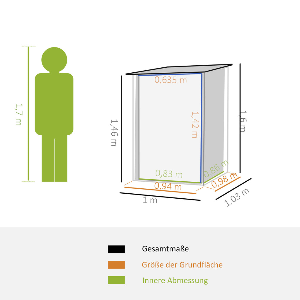 - Schaffen Sie eine paradiesische Ordnung in Ihrem Garten mithilfe dieses großen Geräteschuppens von Outsunny! Trotz seiner kompakten Konstruktion bietet er reichlich Raum für unterschiedlichste Geräte und Werkzeuge. Aus stabilem Stahl gebaut und mit einem wetterfesten Anstrich versehen, wird Ihnen dieser Gartenschrank eine lange Zeit zuverlässig dienen. Das geneigte Dach lässt Regenwasser ungehindert abfließen und die verriegelbare Tür verhindert, dass Tiere eindringen.