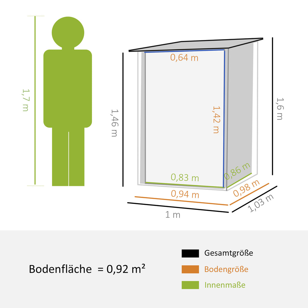• Produktdetails: Gesamtmaße: 100B x 103T x 160H cm, Innenmaße: 83L x 86B cm, Bodenfläche: 94B x 98T cm (0,92 m²).