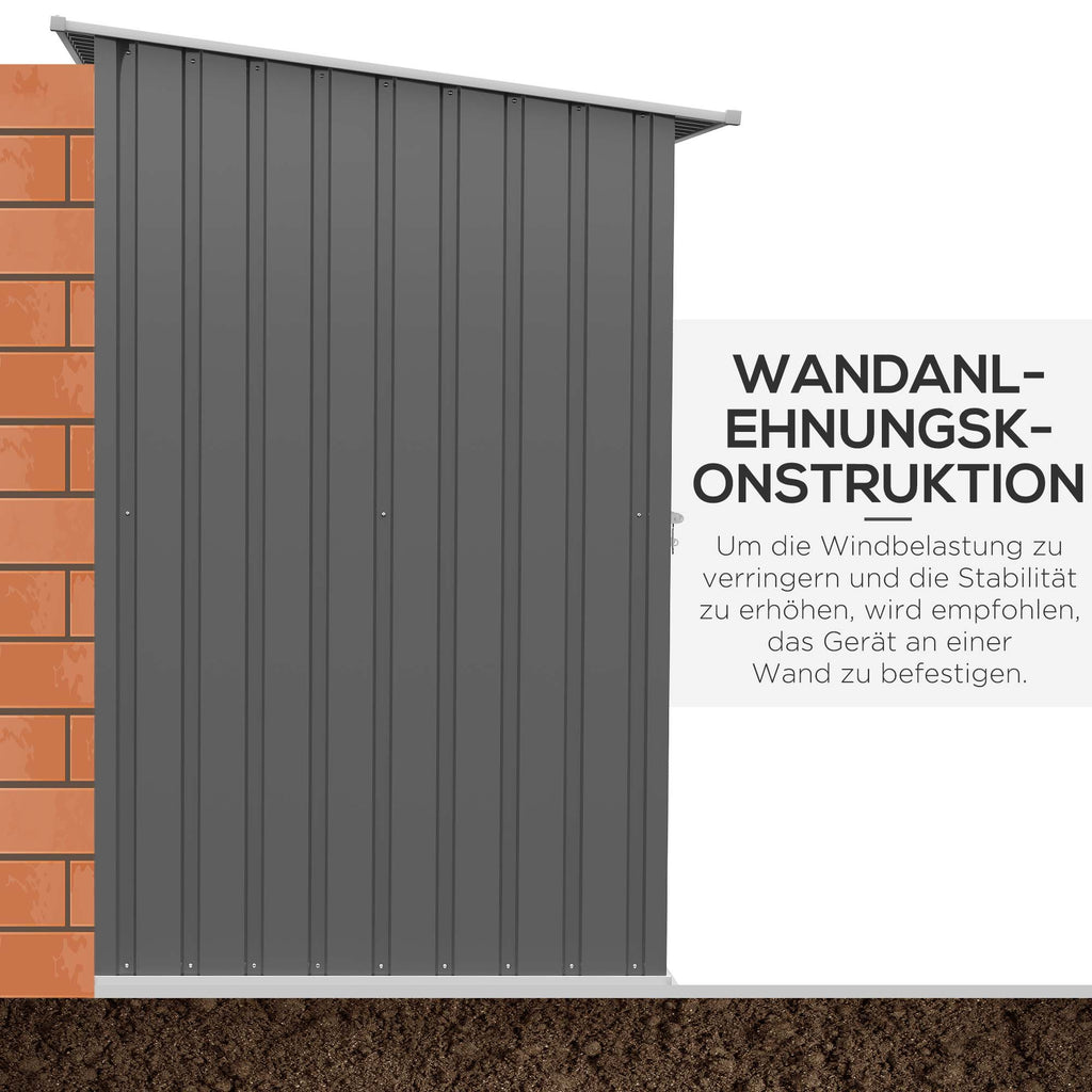 • Neigungsdach des Geräteschuppens verhindert Wasseransammlungen, ideal als Anlehnschuppen