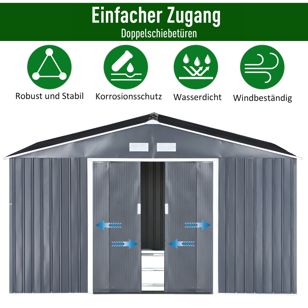 Suchen Sie noch die passende Gartenhütte für Ihre Werkzeuge? Der Outsunny Geräteschuppen mit zwei Schiebetüren und einem stabilen, rostfreien Boden aus verzinktem Stahl ist die ideale Wahl! Aus robustem Metall gefertigt, bietet er viel Platz, Schutz vor Feuchtigkeit und ausgezeichnete Belüftung für Ihre Gartengeräte.