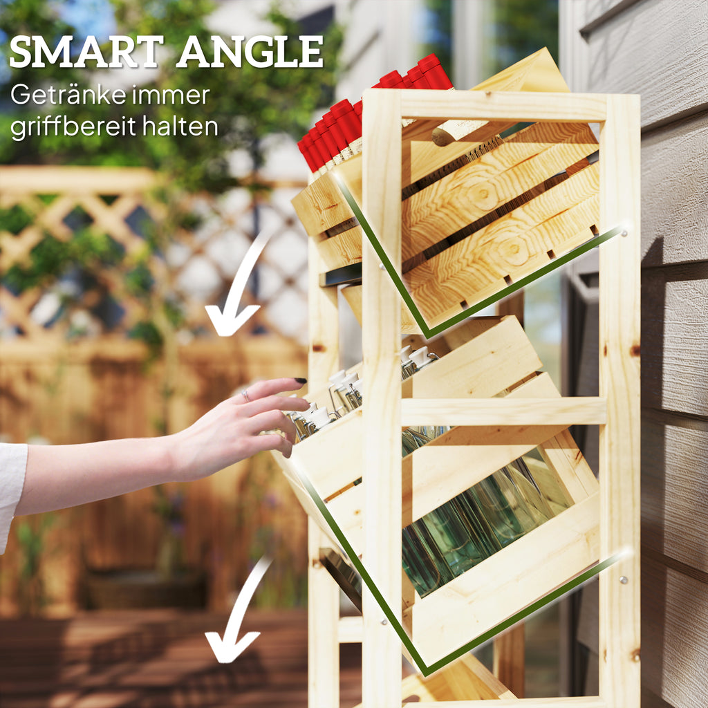 Optimieren Sie Ihre Gartenfeste mit dem Outsunny Outdoor-Getränkekistenregal. Der kompakte 3-Ebenen Kistenständer organisiert Ihre Getränkebehälter effizient und verleiht Ihrem Ambiente einen klassischen Flair. Aus lackiertem Fichtenholz und Edelstahl gefertigt, sichert dieses Getränkekistenregal stabil Bier-, Wein- oder Wasserkisten. Ideal für Drinnen und Draußen, ist es ein unverzichtbares Accessoire für jede Party, jedes BBQ oder jede Hausbar.