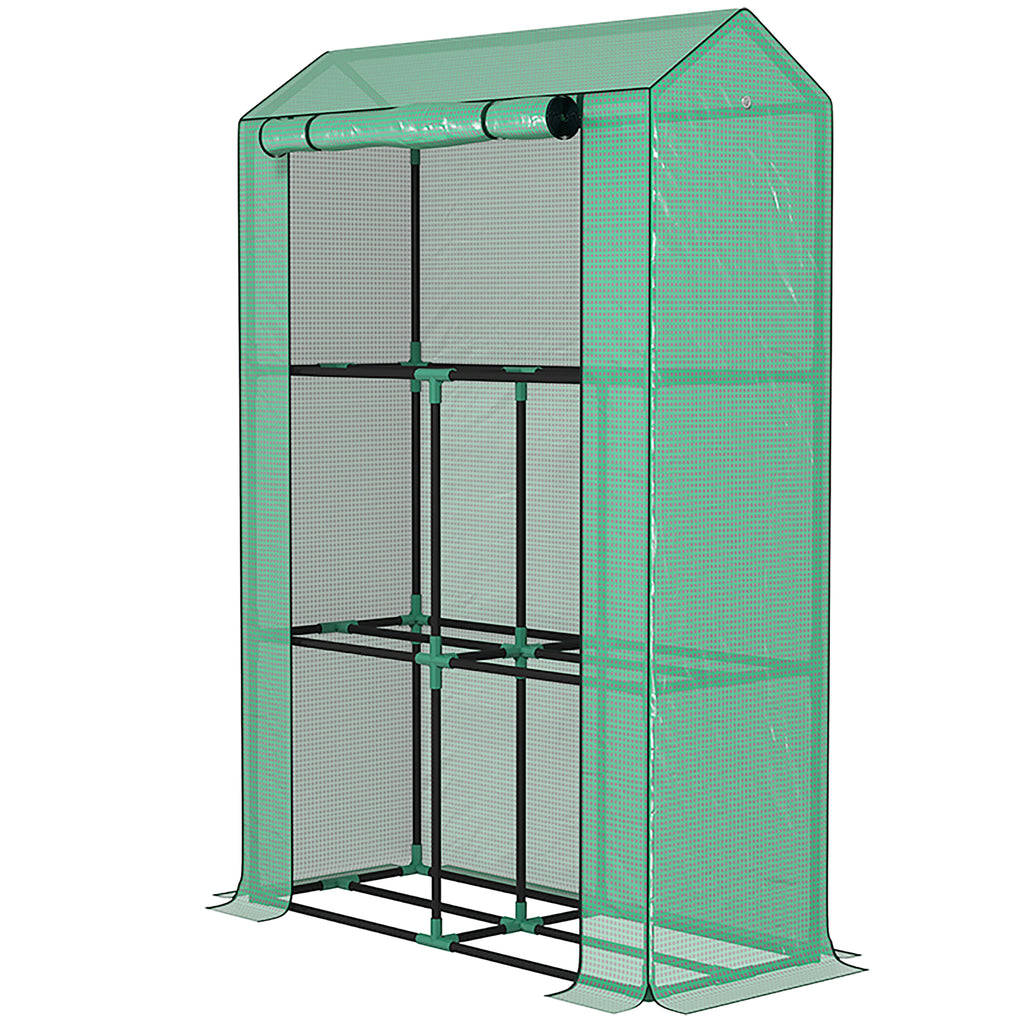 Dieses Outsunny Gewächshaus mit drei Ebenen und Regalen bietet reichlich Raum für Blumentöpfe und Anzuchtplatten, umgeben von einer robusten Kunststoff-Hülle, die Ihre Pflanzen vor UV-Schäden bewahrt und sie mit Sonnenlicht versorgt. Die aufrollbare Tür mit Reißverschluss des Frühbeets erleichtert den Zugang und gewährleistet eine ausgezeichnete Belüftung. Perfektes Tomatenhaus für alle, die eine blühende, transportable Garten-Oase gestalten möchten!