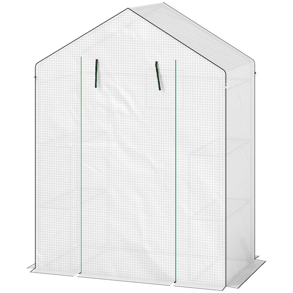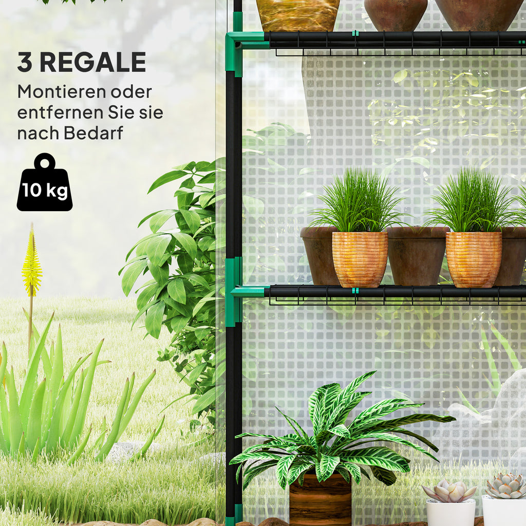 Schluss mit der Sorge um Ihre liebevoll gepflegten Pflanzen! Outsunnys begehbares Gewächshaus mit integriertem Pflanzenständer ist die ideale Lösung für Hobbygärtner. Die UV-beständige Kunststoff-Abdeckung mit hochrollbarer Tür und zwei Netzfenstern des Tomatenhauses reguliert Temperatur und Feuchtigkeit optimal. Durch anpassbare Drahtpaneele des Foliengewächshauses lässt sich der Innenraum zudem je nach Pflanzenhöhe flexibel gestalten.