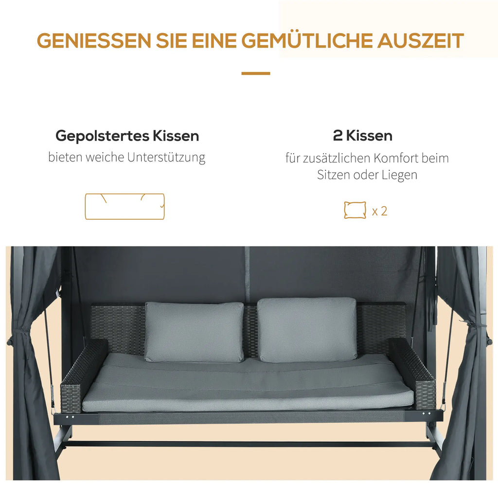 Entspannen Sie sich stilvoll mit diesem Lounge-Set. Auf diesem Outdoor-Schaukelbett von Outsunny können Sie geschützt unter dem Baldachin den Sommer genießen. Der Baldachin und die Seitenwände schützen Sie vor Wind, Regen und unerwünschten Blicken. Bei Bedarf können Sie die Vorhänge zurückziehen und am Rahmen befestigen. Ihre Familie wird den geschützten Lounge-Bereich lieben. Genießen Sie eine Auszeit unter freiem Himmel mit diesem Lounge-Set von Outsunny.
