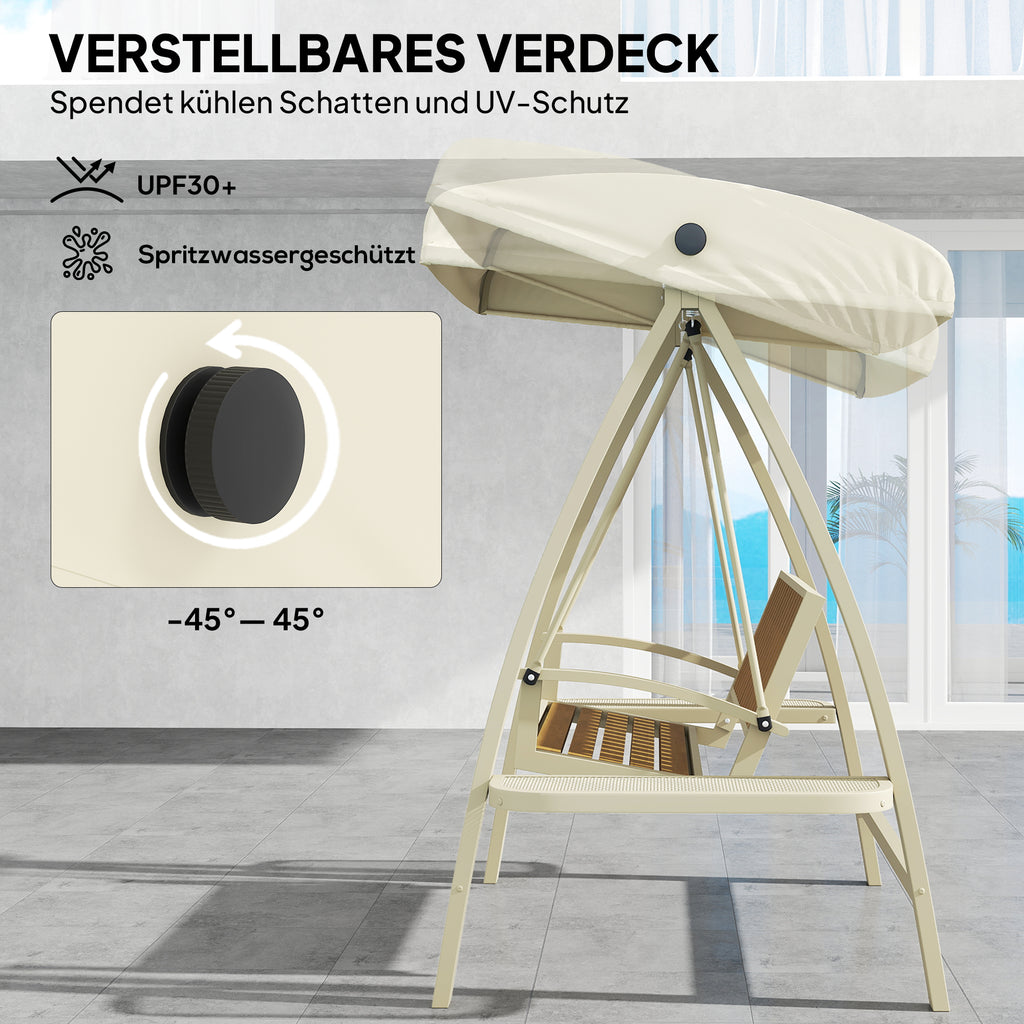 Genießen Sie neue Entspannung mit der Outsunny 2-Sitzer Hollywoodschaukel. Diese Gartenschaukel für Erwachsene bietet zwei bequeme Sitze, umgeben von nützlichen Seitentischen – perfekt für Getränke und Snacks. Der 90-Grad verstellbare, spritzwasserabweisende und UPF30+ Baldachin der Schaukel schützt Sie vor der Sonne und garantiert ein angenehmes Erlebnis auf Ihrer Schaukelbank.