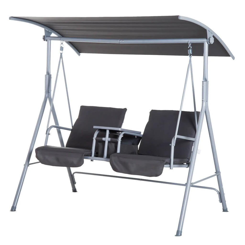 Genießen Sie stimmungsvolle Stunden in Ihrem Garten. Unsere elegante 2-Sitzer Gartenschaukel bringt romantische Atmosphäre zu Ihnen nach Hause. In der Mitte der beiden Sitzflächen ist ein praktischer Becherhalter samt Taschen angebracht. Das neigungsverstellbare Sonnendach schützt Sie vor intensiver Sonneneinstrahlung und leichtem Regen. Damit Sie Ihre Schwingliege perfekt im Freien einsetzen können, ist das pulverbeschichtetem Gestell gefertigt.