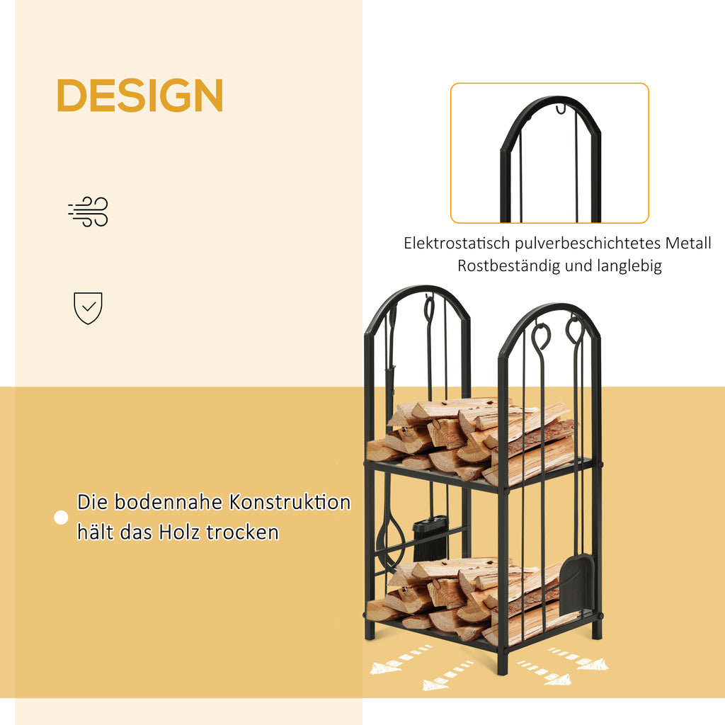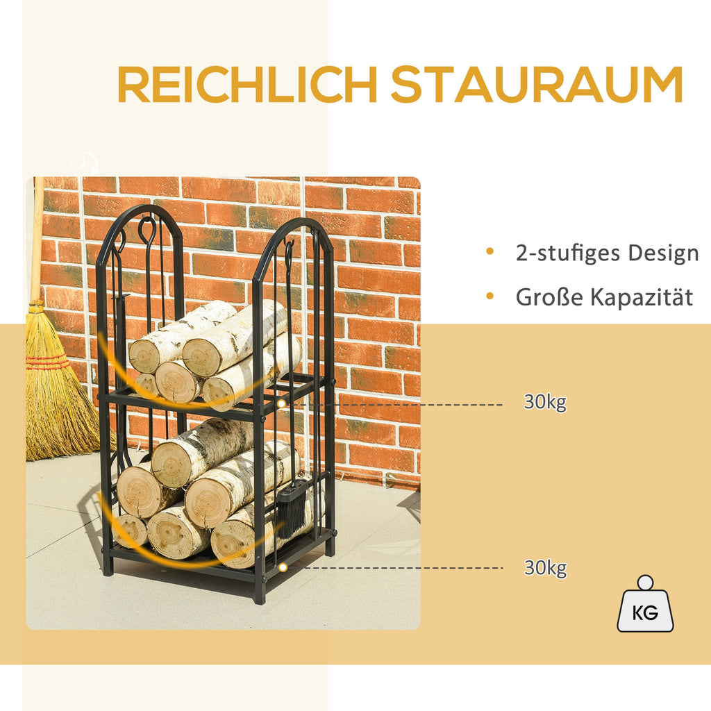Mit diesem 2-stufigen Kaminholzständer von Outsunny haben Sie Ihr Brennholz immer griffbereit, was perfekt für die Terrasse, den Garten, den Hof oder drinnen in der Nähe des Kamins ist. Es ist ideal zum Trocknen von Holz, da es nicht auf dem Boden steht, sondern vom Wind umströmt wird. Und wir haben extra 4 Werkzeuge für Sie, um alle Ihren täglichen Gebrauch zu lösen, einschließlich einer Schaufel, Besen, Schürhaken und Zange, und 4 Haken zu hängen und zu vermeiden, zu verlieren.