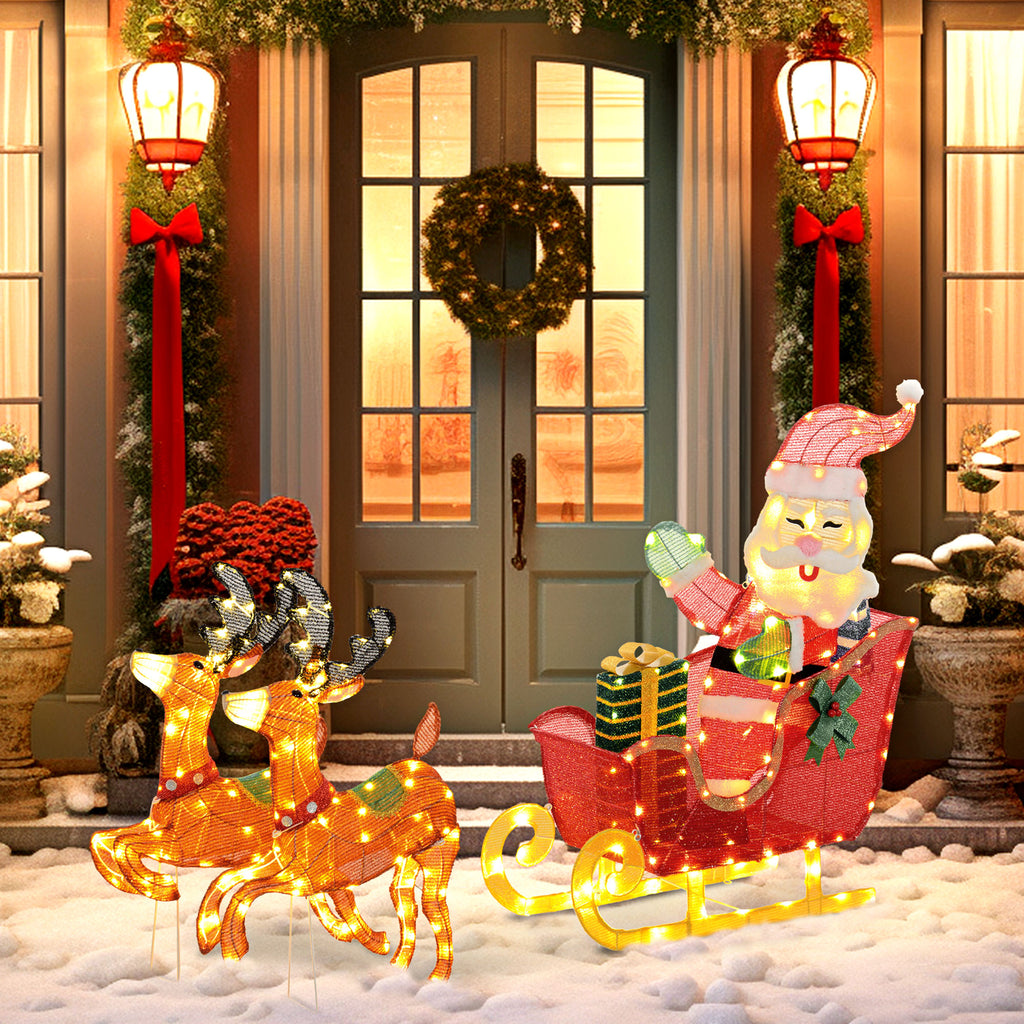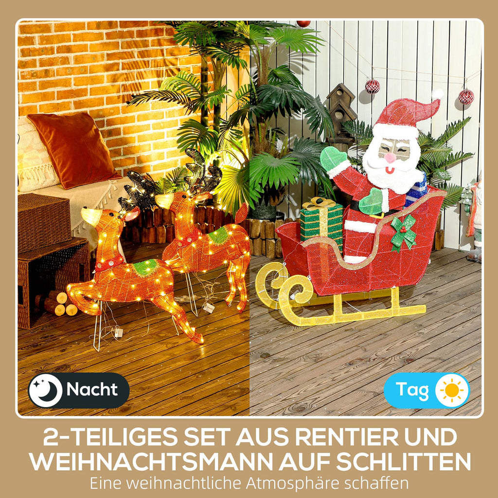 Verwandeln Sie Ihren Garten in ein Winterwunderland mit den strahlenden Weihnachtsdekorationen von Outsunny. Unser festliches Rentier- und Schlittenset, schön und farbenfroh verziert, wertet Ihre Weihnachtsdekoration enorm auf. Warmweiße LED-Lichter der Weihnachtsbeleuchtung sorgen nachts für eine behagliche Atmosphäre. Ideal für drinnen und draußen geeignet, um die Festtage zu erleuchten.