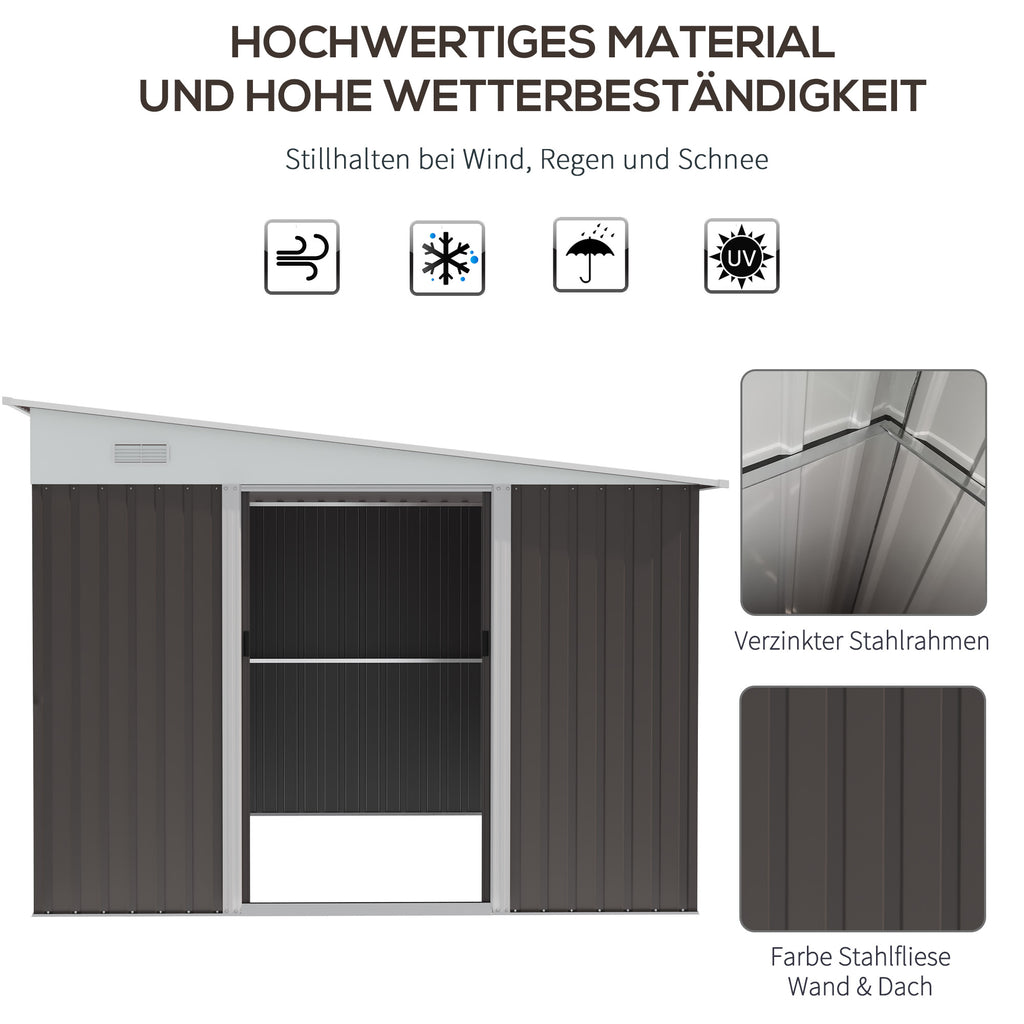 Bringen Sie mit dem Gartenschuppen von Outsunny Stil und Funktionalität auf Ihr Grundstück. Der robuste Metallschuppen, verzinkt und wetterfest, bietet nicht nur reichlich Stauraum, sondern auch einen zuverlässigen Schutz für Ihre wertvolle Ausrüstung. Die einfache Zugänglichkeit, angenehme Belüftung und die platzsparenden Doppelschiebetüren machen diesen Geräteschuppen zur optimalen Wahl für Ihre Gartenbedürfnisse.