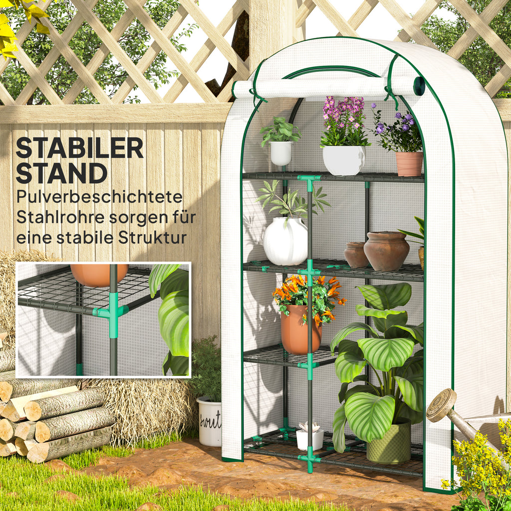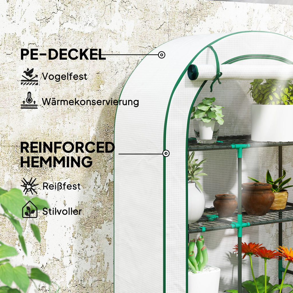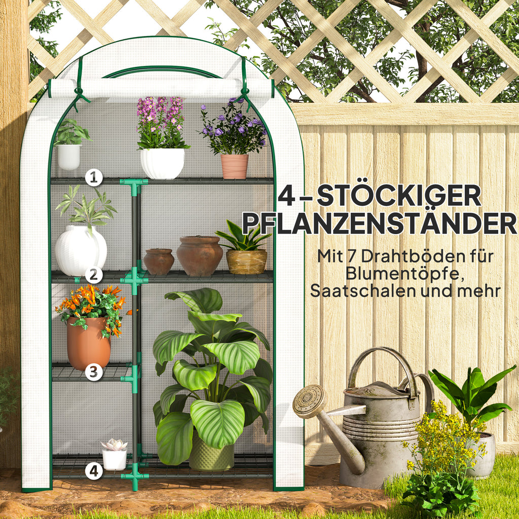Das Vier-Ebenen-Design dieses Gewächshauses von Outsunny bietet ausreichend Platz für Blumentöpfe und Anzuchtschalen, alles geschützt durch eine 140g/m² starke Kunststoff-Abdeckung, die vor UV-Strahlen schützt und reichlich Sonnenlicht bietet. Die hochrollbare Tür des Tomatenhauses mit Reißverschluss ermöglicht leichten Zugang und gewährleistet eine optimale Belüftung. Perfekt für Enthusiasten kleiner Gewächshäuser, die sich eine mobile Garten-Oase wünschen!