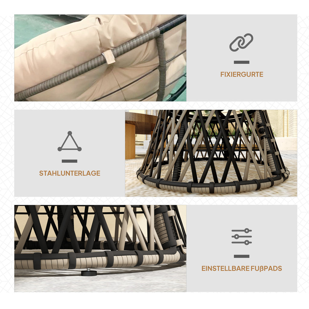Perfekt für Garten, Veranda oder Balkon, sorgt dieser Rattan-Papasansessel für erstklassigen Komfort. Dank der 360°-Drehfunktion finden Sie leicht eine gute Position zum Sonnen oder um die Blendung zu vermeiden. Lehnen Sie sich tief in das dicke Polster zurück und genießen Sie Entspannung pur mit dem praktischen eingebauten Seitentisch. Dieser aus wetterfesten Materialien hergestellte Rattan-Papasansessel ist ideal für den Außeneinsatz. Wählen Sie Outsunny und genießen Sie Komfort im Freien.