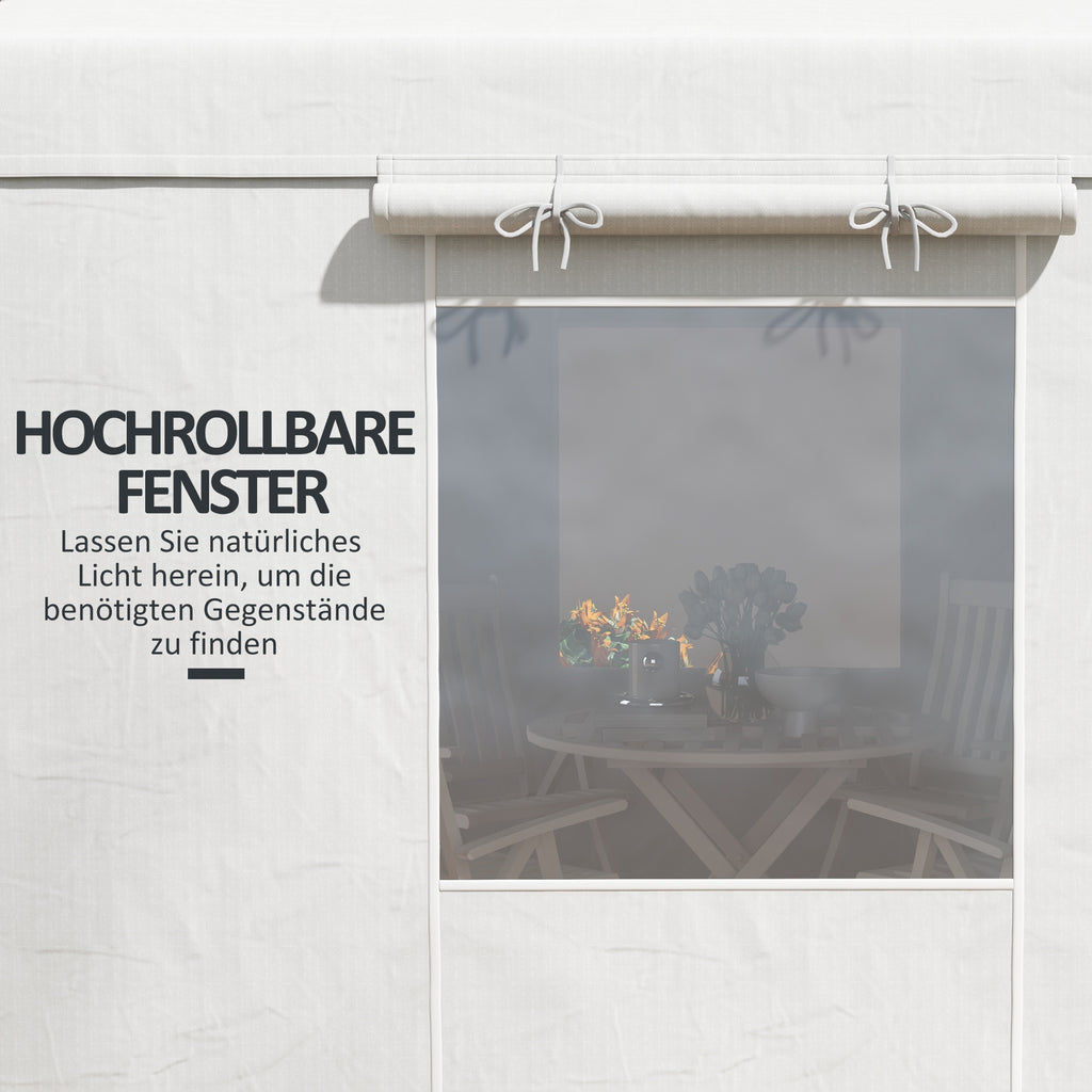 Mit unserer Outsunny Winterabdeckung für Pavillons verwandeln Sie Ihren Pavillon in einen funktionalen Stauraum. Das wasserdichte Material sorgt dafür, dass der Regen einfach abfließt und sowohl die Laube als auch die Gegenstände, die Sie darin aufbewahren, trocken bleiben. Die Öffnungen mit Reißverschluss ermöglichen einen einfachen Zugang. Außerdem sorgen die aufrollbaren Fenster für viel natürliches Licht.