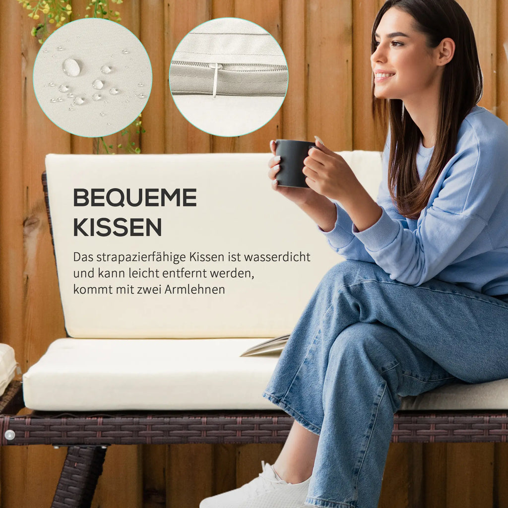 Dieses moderne Rattan-Sofa von Outsunny zeichnet sich durch ein schlichtes, zeitloses Design und eine hochwertige Verarbeitung aus. Dank des robusten, rostfreien Stahlrahmens und der widerstandsfähigen Verkleidung aus wetterfestem, künstlichem Rattan ist dieses Gartensofa ideal für die ganzjährige Verwendung im Freien geeignet. Die Armlehnen lassen sich einfach herunterklappen, sodass Sie sich komfortabel hinlegen oder die Seitenteile als praktische Ablageflächen nutzen können.