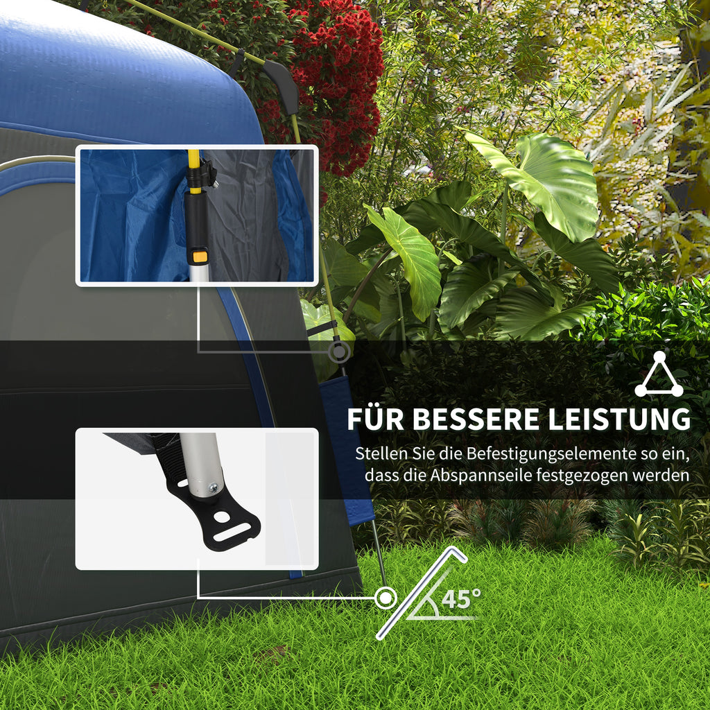 Das Outsunny 3-Saison-Campingzelt ist ideal für Tagesausflüge, Übernachtungen und Anfänger-Backpacking. Dank vormontierter Stangen lässt dieses Kuppelzelt sich leicht aufklappen und in ein einsatzbereites Schutzdach verwandeln! Zum Zusammenklappen für Lagerung oder Transport einfach den Knopf am Zeltgipfel drücken. Erleben Sie mit diesem exzellenten Outsunny Kuppelzelt die Natur! ACHTUNG: Nicht für extremste Wetterbedingungen wie starken Wind, heftigen Regen oder Schnee geeignet.