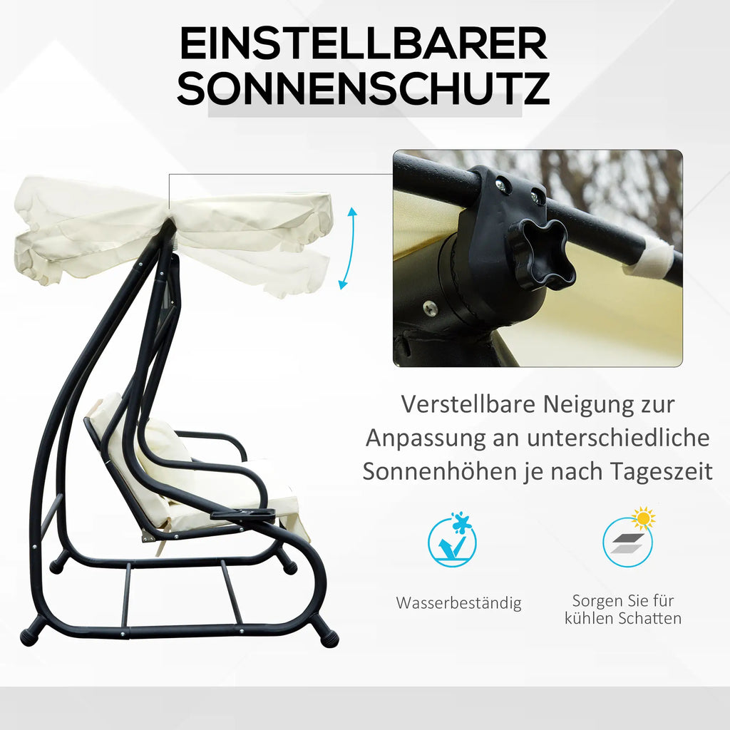 Mit seinem langlebigen Metallrahmen und bequemen gepolsterten Sitzgelegenheiten, die einen großartigen Ort zum Entspannen bieten werden. Die verstellbare Abdeckung der Gartenschaukel bietet Schutz vor der Sonne und mit einem Becherhalter auf jeder Seite, um Ihre Lieblingsgetränke zu halten. Die Schaukel selbst ist verstellbar, sodass es in einer aufrechten Sitzposition eingestellt werden kann, oder es kann in die Stützstange einrasten und ein Liegebett werden.
