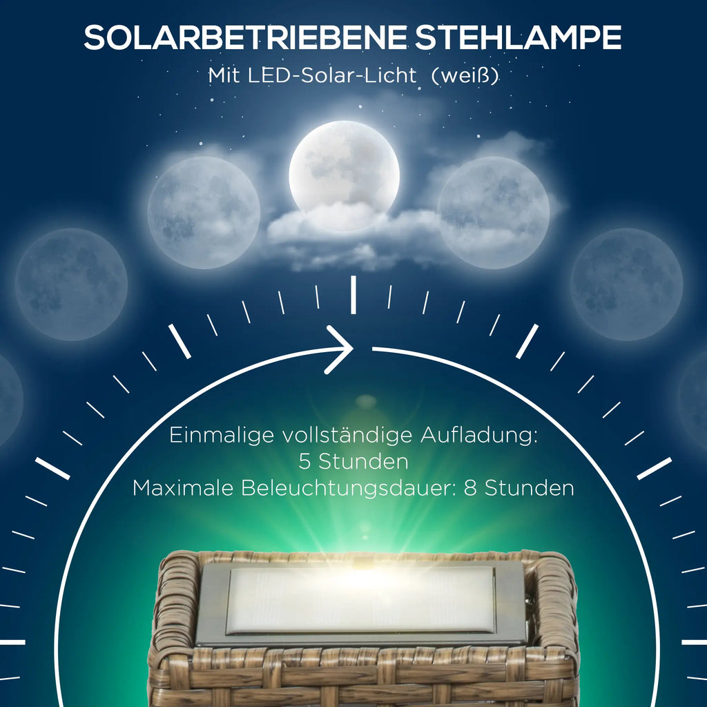 Diese wunderschöne Außenleuchte mit einem Gehäuse aus natürlich anmutenden Rattangeflecht fügt sich ideal in jeden Garten oder auf jede Terrasse. Warmweiß strahlend, bringt die Leuchte eine heimische und wohlige Stimmung. Dank des Solarbetriebs lädt sich die Leuchte tagsüber auf und bietet bis zu 8 Stunden Leuchtzeit, während sie sich automatisch ein- und ausschaltet. Der stabile Stahlrahmen und das robuste Kunststoffrattan machen diese Leuchte ideal für einen dauerhaften Einsatz im Freien.