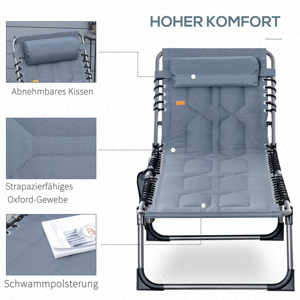 Genießen Sie Entspannung an der frischen Luft mit diesem klappbaren wetterfesten Sonnenliege von Outsunny. Die Rückenlehne der Klappliege kann in fünf Positionen verstellt werden, um verschiedenen Bedürfnissen gerecht zu werden. Das robuste Gestell und die weiche, angenehme Polsterung der Kippliege sorgen für ein komfortables Liegegefühl, während ein abnehmbares Kissen Ihren Kopf und Nacken stützt. Die klappbare Sonnenliege lässt sich zudem leicht auf ein kompaktes Format zusammenfalten, sodass sie einfach zu transportieren und zu verstauen ist.