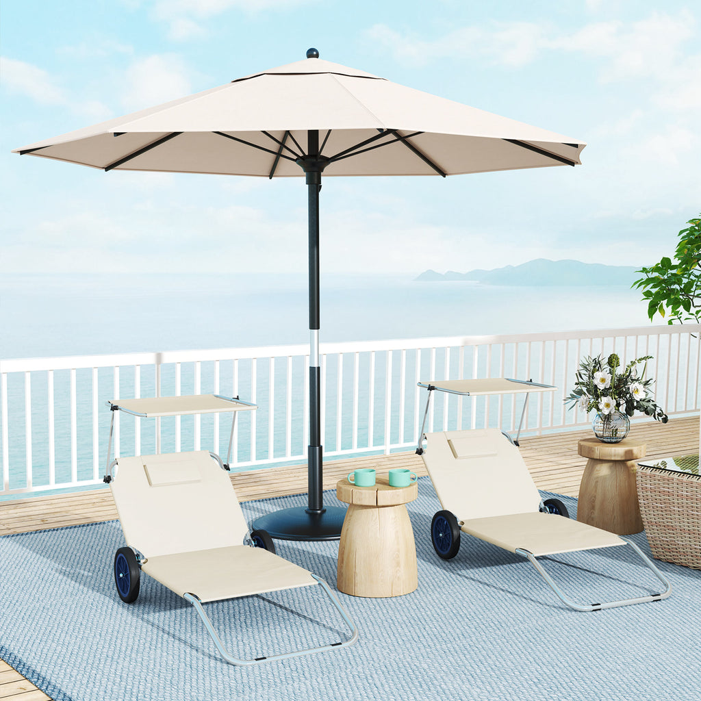 Genießen Sie entspannte Stunden mit den Outsunny Strandliegen. Beide Sonnenliegen bieten ein justierbares Sonnendach (0-90°), das Schatten spendet, sowie eine Rückenlehne, die bis zu 180° neigbar ist, für optimalen Komfort. Dank der integrierten Räder sind die Sonnenliegen einfach zu verschieben und lassen sich zum Transport mühelos zusammenfalten. Perfekt für Tage am Strand oder entspannte Momente im Garten.