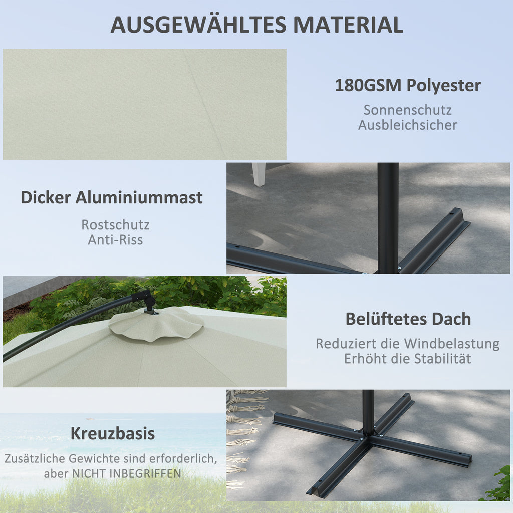 Der Sonnenschirm von Outsunny ist 3 Meter lang und freitragend. So können Sie den ganzen Tag die Sonne genießen. Dank seiner 8 Rippen ist der Schirm besonders stabil. Dieser Sonnenschirm verfügt über einen Kurbelmechanismus zum mühelosen Öffnen und Schließen und bietet Ihnen viel Schatten vor der Sonne in einem Winkel, den Sie selbst bestimmen können. Unser Gartenschirm spendet Ihnen den ganzen Sommer über wohltuenden Schatten.