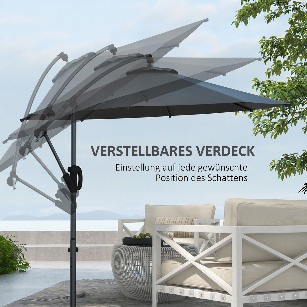 Der Sonnenschirm von Outsunny ist 3 Meter lang und freitragend. So können Sie den ganzen Tag die Sonne genießen. Dank seiner 8 Rippen ist der Schirm besonders stabil. Dieser Sonnenschirm verfügt über einen Kurbelmechanismus zum mühelosen Öffnen und Schließen und bietet Ihnen viel Schatten vor der Sonne in einem Winkel, den Sie selbst bestimmen können. Unser Gartenschirm spendet Ihnen den ganzen Sommer über wohltuenden Schatten.