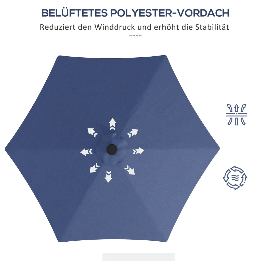 Dieser raffinierte Gartenschirm spendet nicht nur reichlich Schatten, sondern macht auch die Nacht zum Tage! Die integrierten Solar-LEDs sorgen für stimmungsvolles Licht bis zu 5 Stunden lang nach nur 4-stündiger Aufladung. Genießen Sie eine freie Sicht, ohne störenden Schirmmast in der Mitte. Der robuste Stahlmast und die Streben gewährleisten einen stabilen Stand, während das Lüftungsdach für optimale Windstabilität sorgt. Inklusive Schutzhülle für die perfekten Schutz bei Nichtgebrauch.