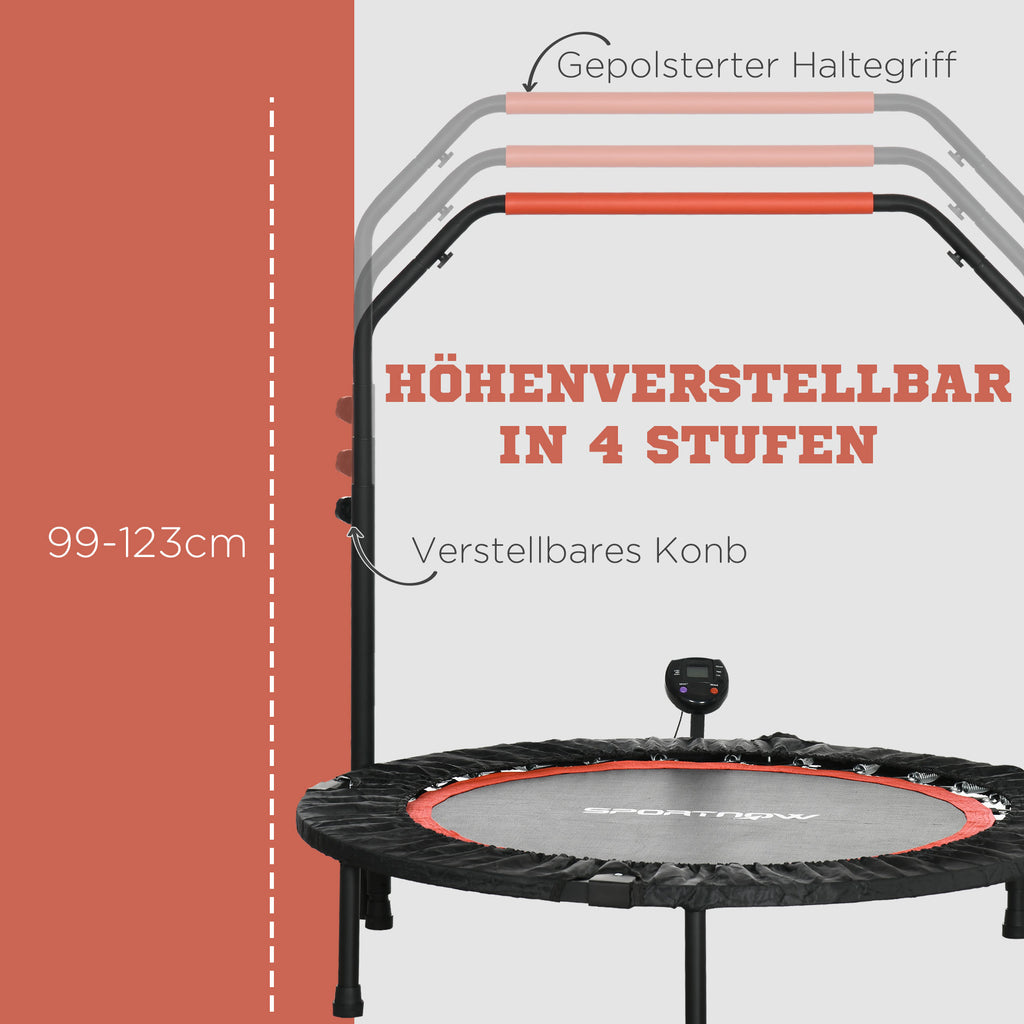 Unglaublich effektiv und einmalig kompakt: Dieses praktische Minitrampolin von SPORTNOW sorgt garantiert für ein schweißtreibendes, wirkungsvolles Workout und viele verbrannte Kalorien! Stärken Sie zudem Ihren Core, verbessern das Gleichgewicht und gewinnen fast spielend eine bessere Haltung. Das Trampolin besitzt einen stabilen Stahlrahmen, kann bis zu 100 kg tragen und ist mit einem praktischen, höhenverstellbarem Haltegriff ausgestattet. Die rutschfesten Gummifüße schützen zudem Ihren Boden.